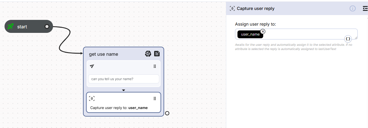 What we want now is to block the flow until the user replies with their name, then assign the captured name to a flow attribute.