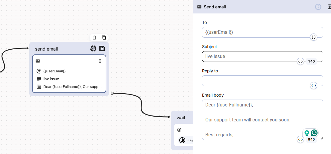 By clicking on the “Send Email” action, a pop-up window will appear on the right side of the page. From there, you can define the email address to which you want to send the email (which we asked for before).