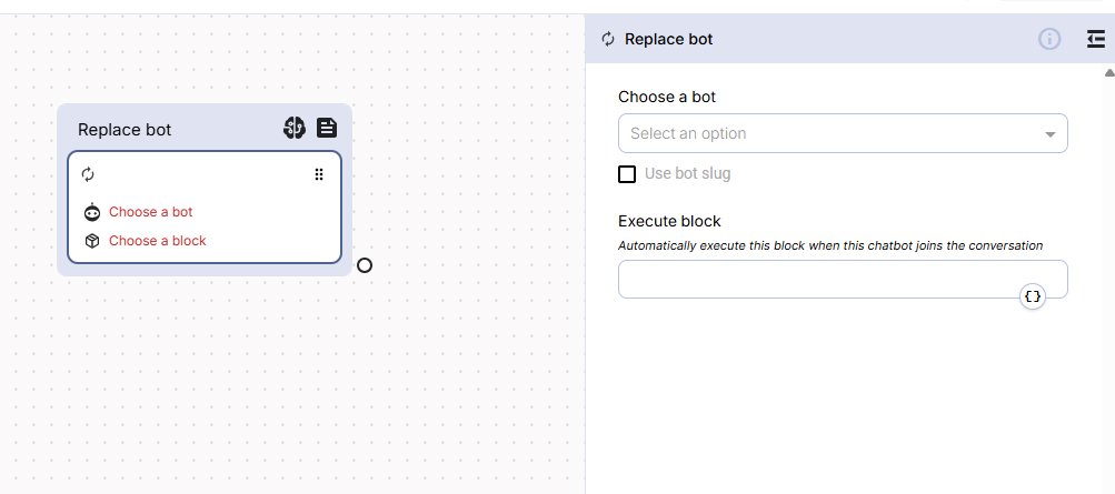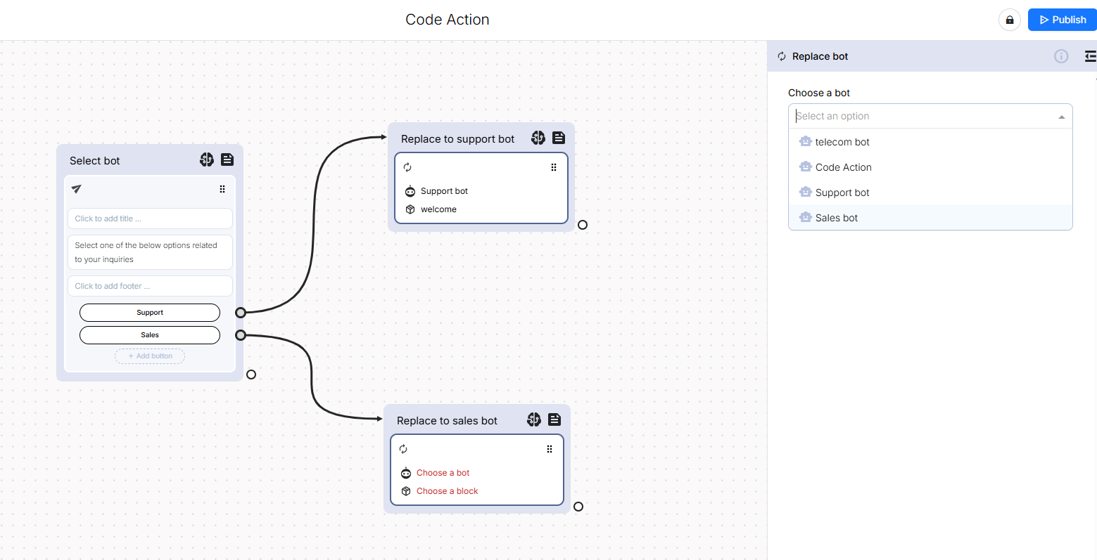 To implement this feature, you first need to create different bots for different purposes. When you want to recall another bot, you need to drag the “Replace Bot” action as shown in the image below: