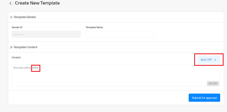 - In the content section, click the "Add OTP" button. The placeholder 'XXXX' will appear in the content, reflecting the code length. However, the actual message will display a system-generated OTP code.