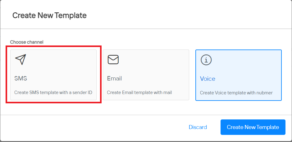 - A pop-up will prompt you to select the channel type. Choose SMS and click the "Create New Template" button.