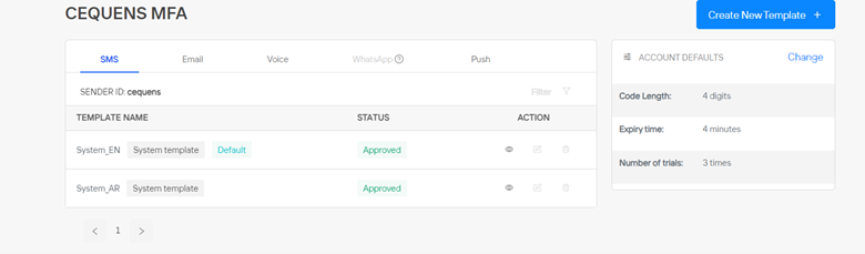 - All created SMS templates will be displayed in the SMS tab on the Multi-Factor Authentication (MFA) page.