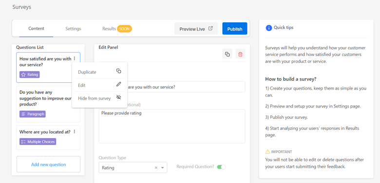 - Content Tab: Create questions. Edit or duplicate questions before feedback submission. Click on the three-dot menu next to a question to edit or duplicate it. Questions cannot be edited or deleted after users start submitting feedback.