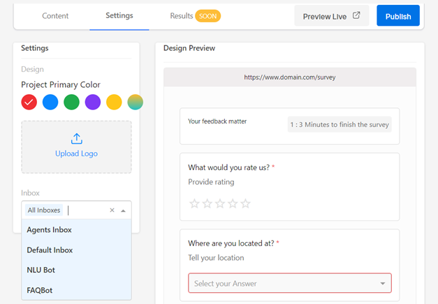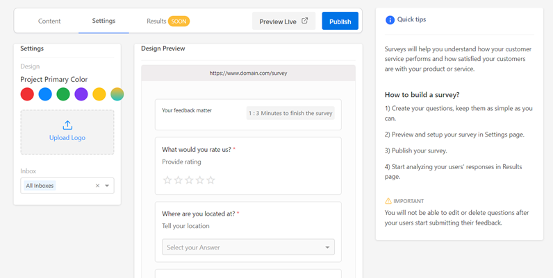 - Settings Tab: In this tab, you can adjust settings related to the design of your survey. This includes changing the color scheme, adding a logo, and selecting an inbox.