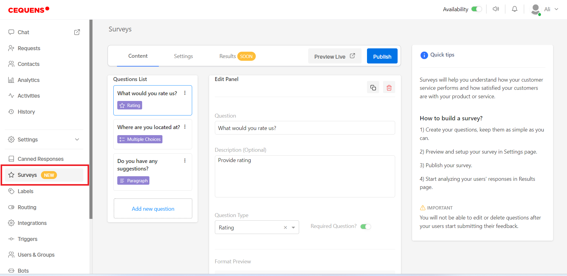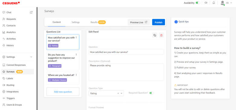 - Results Tab: Here, you can analyze the responses from your survey. This provides valuable insights into customer feedback and satisfaction levels.