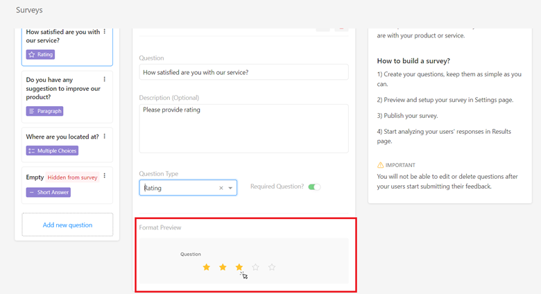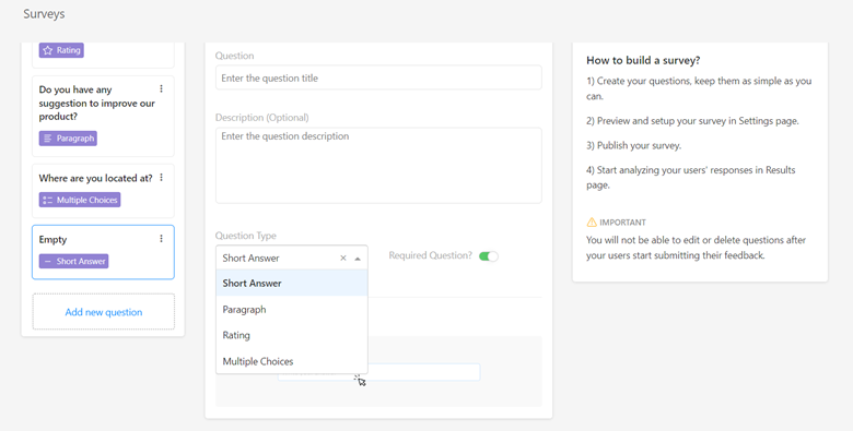 - Click "Add New Question" to create a question. Enter title, description, question type (short answer, paragraph, multiple choice, rating).