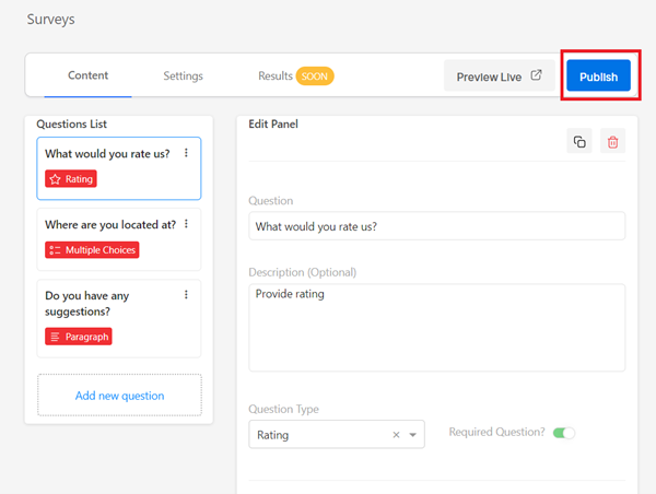 - Once you're satisfied with your survey template, click "Publish" to save it. This enables you to use the survey in conversations with customers, gathering valuable feedback to improve your service.