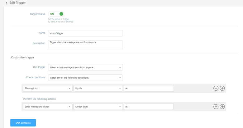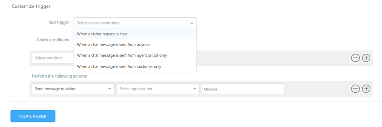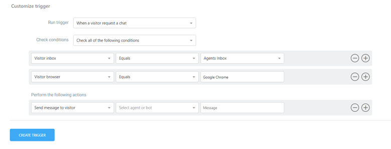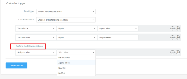 - In the "Perform the Following Actions" section, users can specify the actions to be taken when the trigger is activated. This includes sending a message to the visitor, assigning to an inbox, changing request status, closing a request, and handling agent join or leave requests.