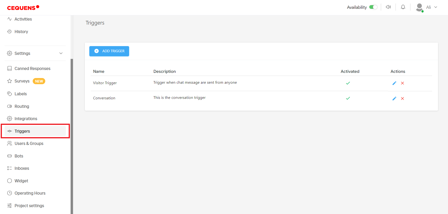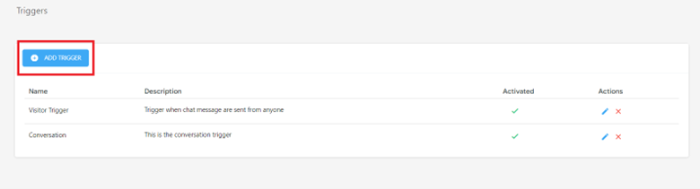 - Upon entering the trigger listing page, all created triggers are displayed, indicating their activation status. Users can manage triggers, including editing or deleting them, by utilizing the icons provided in the actions column.