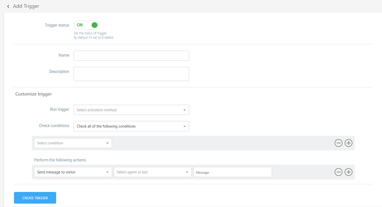 - When adding a new trigger, users can toggle the trigger status, enter a name and description, and proceed to customize the trigger settings.