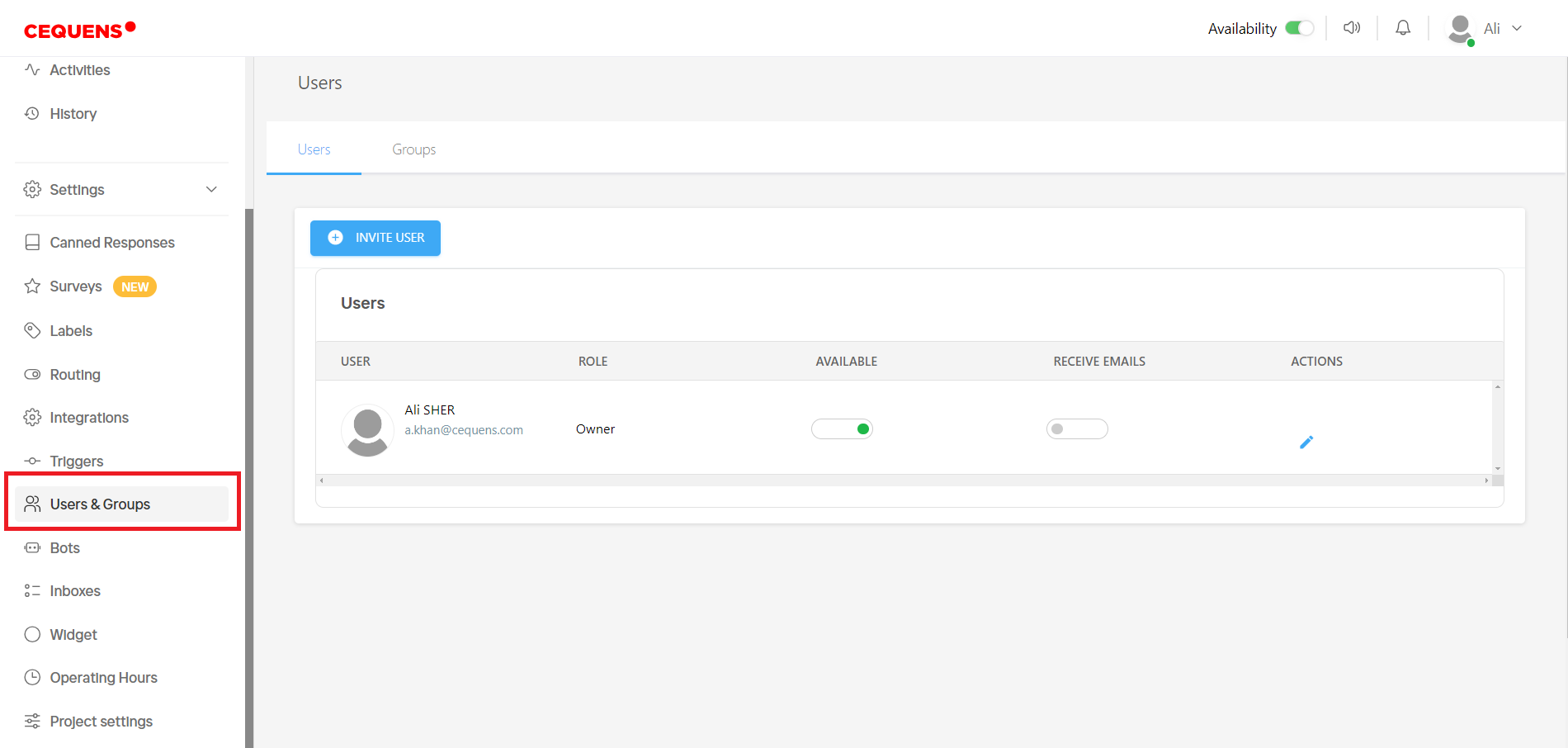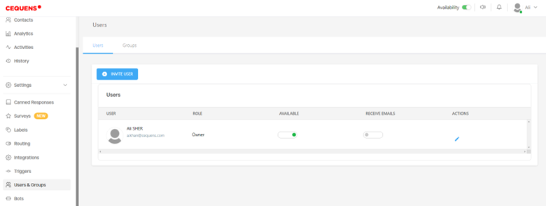- In the "Users" tab, all invited users are listed, displaying their details such as Name, Email, Role, Availability Status, and Email Reception Status.