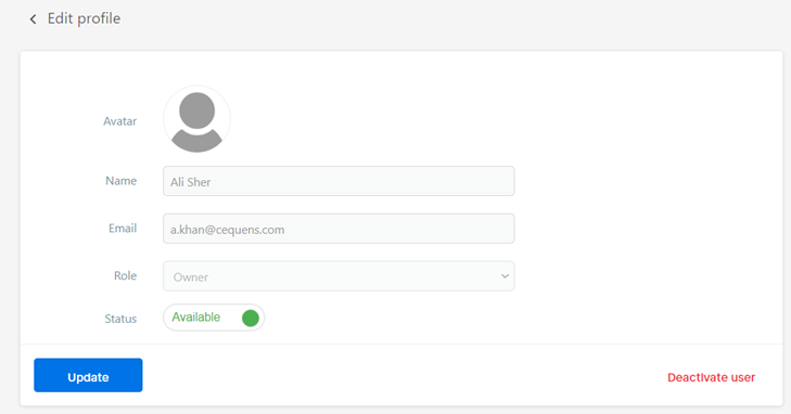 - From the actions column, users' details like name, email, role, and status can be edited by clicking on the edit icon. You can also deactivate the user by clicking on Deactivate User option.