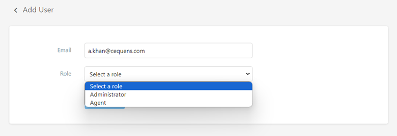 - Enter the user's email address and select their role from three options: Owner, Administrator, or Agent.