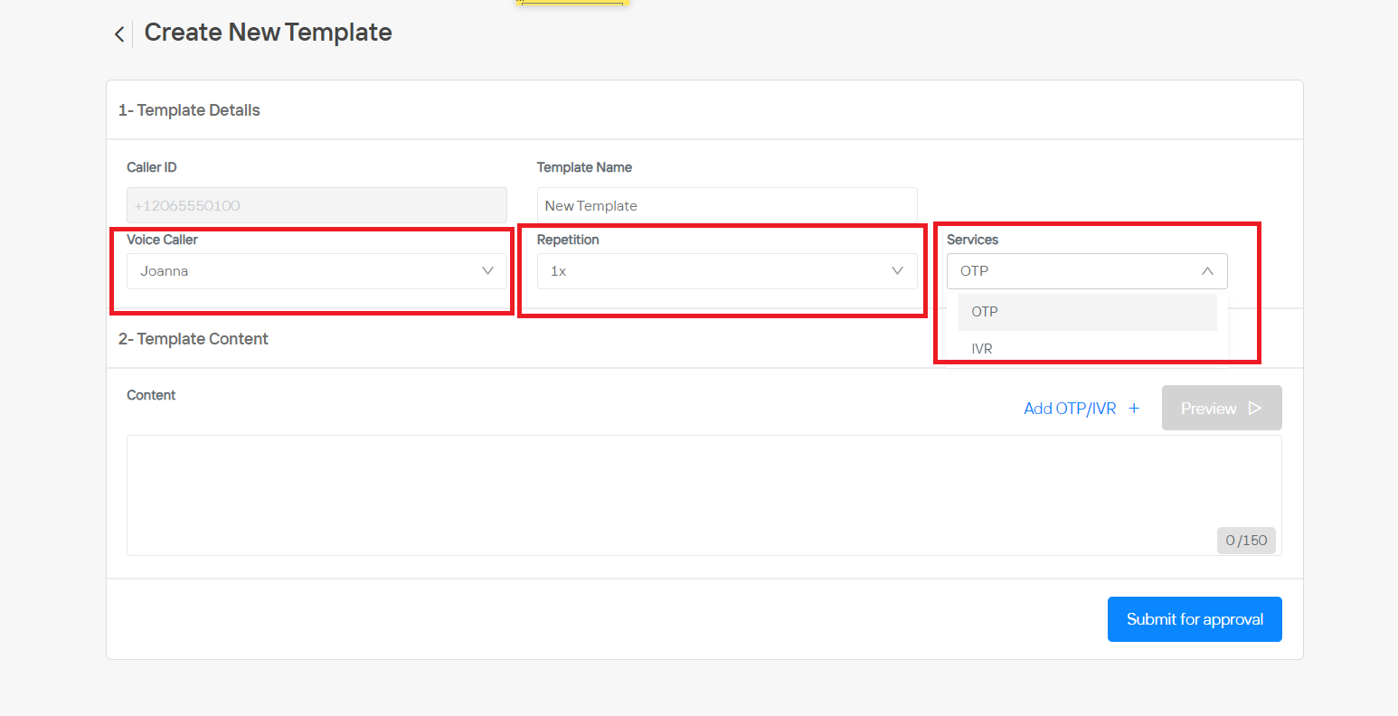 - Select the caller ID, enter the template name, choose the voice caller from the dropdown menu, and specify the time for the recording to be played from the Repetition dropdown menu. Then, select the desired service from the options provided (OTP or IVR).